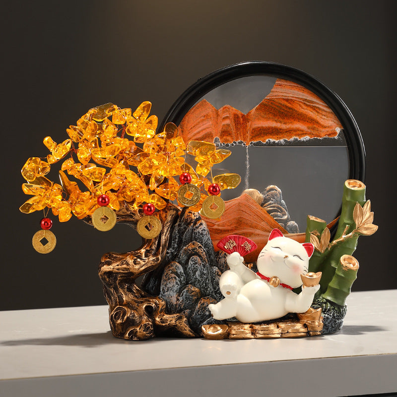 這款擺件將「動態藝術」與「傳統風水」完美融合。流動的沙畫象徵「財源滾滾」,金光閃爍的發財樹寓意「事業常青」,搭配神態悠閒的招財貓,為您的居家空間或店面營造出吉祥、活潑且富有質感的藝術氛圍。